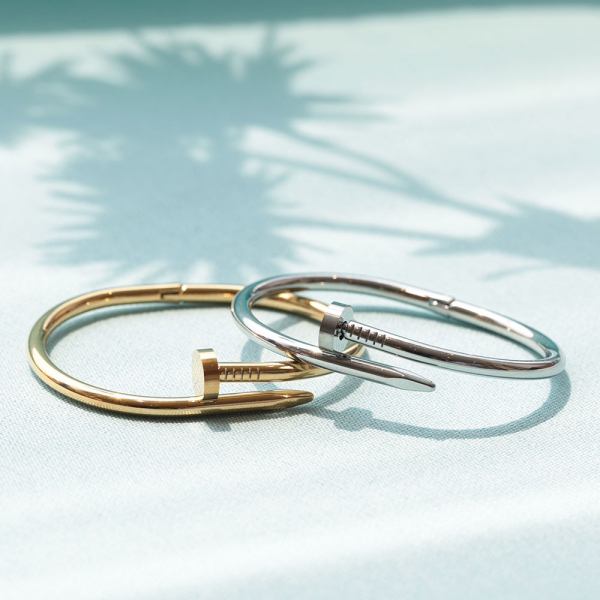 Brazalete en forma de clavo. Colores: Dorada y plateada. Material: Fantasía. Nota: Llámanos al 23370012 o escríbenos al WhatsApp 55583678 para indicar el color que deseas.