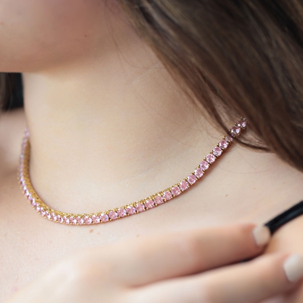 Collar de metal dorado con zirconias rosadas. Medida: zirconias de 4mm, collar de 16” Material: Fantasía